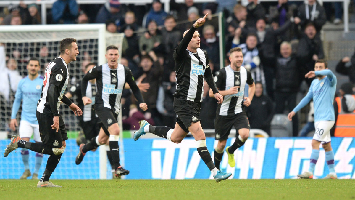 Jonjo Shelvey membuat peluang emas untuk Newcastle di menit ke-19 via tendangan bebas di sisi kiri. Tapi, bola masih menyamping tipis di sebelah gawang City.